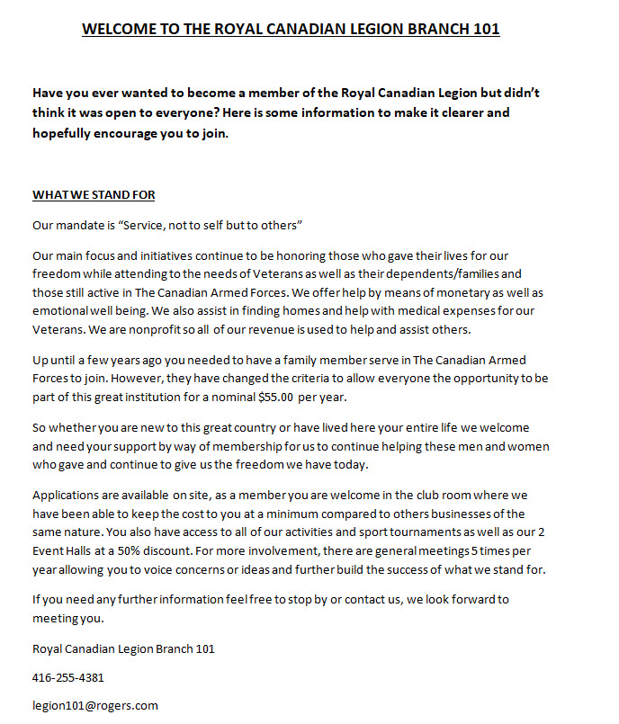 We will be reopen to the public with 50 per cent capacity limits effective Jan 31 2022, pandemic procedures will still be in place. Schedule of our in house Legion events and start up dates. Cribbage - Tues. 7pm Snooker League - Thurs., 6pm Euchre - Mon. 7pm Bingo - Thurs. Feb. 17th, 2pm Meat Spin - Sat. Feb. 19th, 2pm Senior euchre on Wednesday afternoons We still have our wings and beer special on Tuesday and Thursday nights from 6pm onward! Best deal in town!!